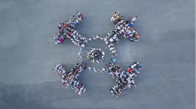 空中拍摄集体照,有另一种震撼。每个员工似乎都只是一个微不足道的小点,但是凝聚在一起时,却谱写出了一幅壮美的画面。
